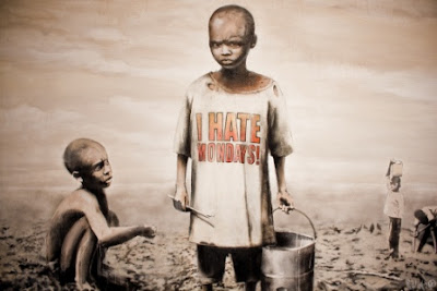 As well as some new artworks, Banksy’s installations also include many of his old stencil designs such as the monkey with the slogan: “Laugh now but one day we’ll be in charge’; “This is not a photo opportunity”; dog urinating up a wall; policeman eating a banana; “Buried treasure ‘X’ marks the spot”, and “I Hate Mondays’.