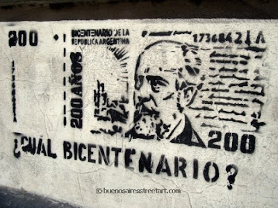 Even more graffiti appeared on the streets exactly a year ago coinciding with the bicentenary. There were lavish events to mark the anniversary with the reopening of Teatro Colon and festivities in Plaza de Mayo and Avenida 9 de Julio. Plenty of stencils were painted around Buenos Aires at the time mocking the celebrations and the state of the nation.