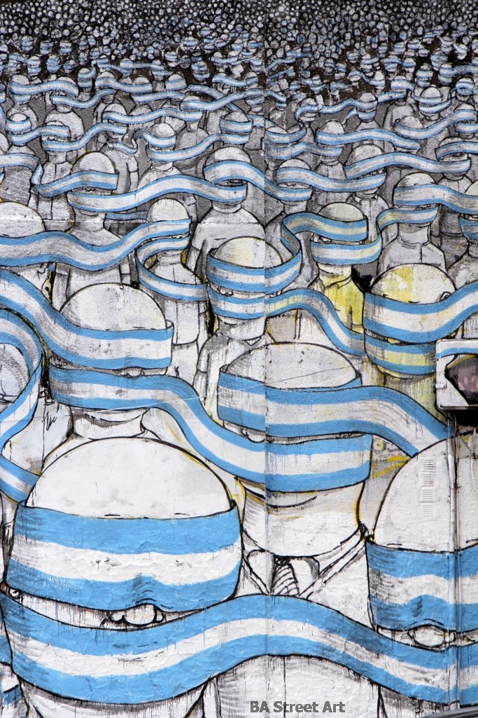New mural by Blu in Buenos Aires. It features hundreds of figures with their eyes covered by one endless blindfold in the colours of the Argentine national flag. Exclusive photos by Buenos Aires Street Art.