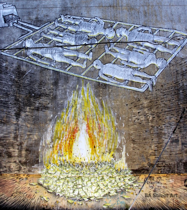 Blu is in Buenos Aires and has just finished painting another politically charged mural. It features six figures being roasted on a grill by the flames from a huge pile of burning bank notes. Argentines love to have barbecues (asados) and it looks like Blu has chosen a similar theme for his latest critique.