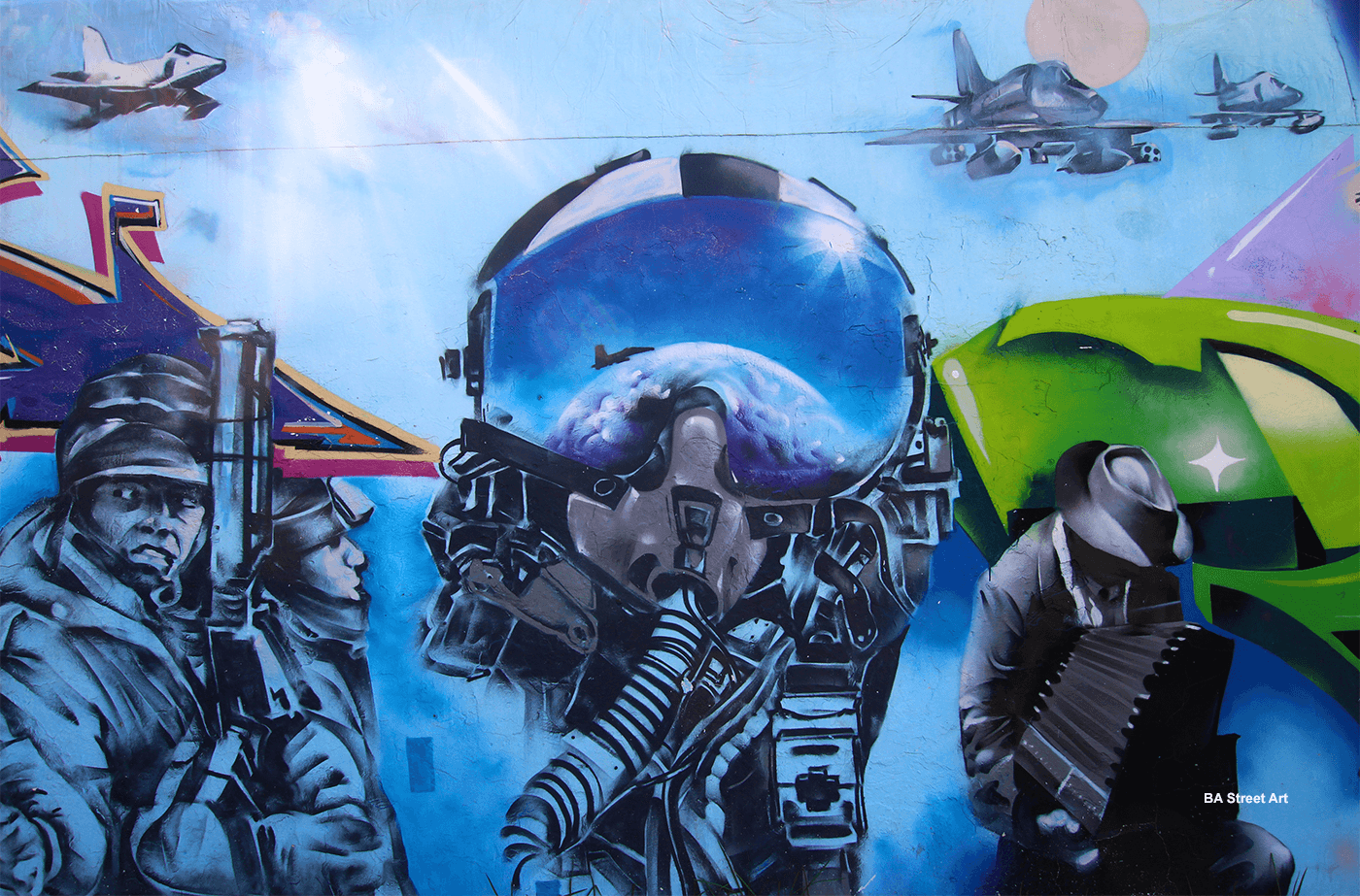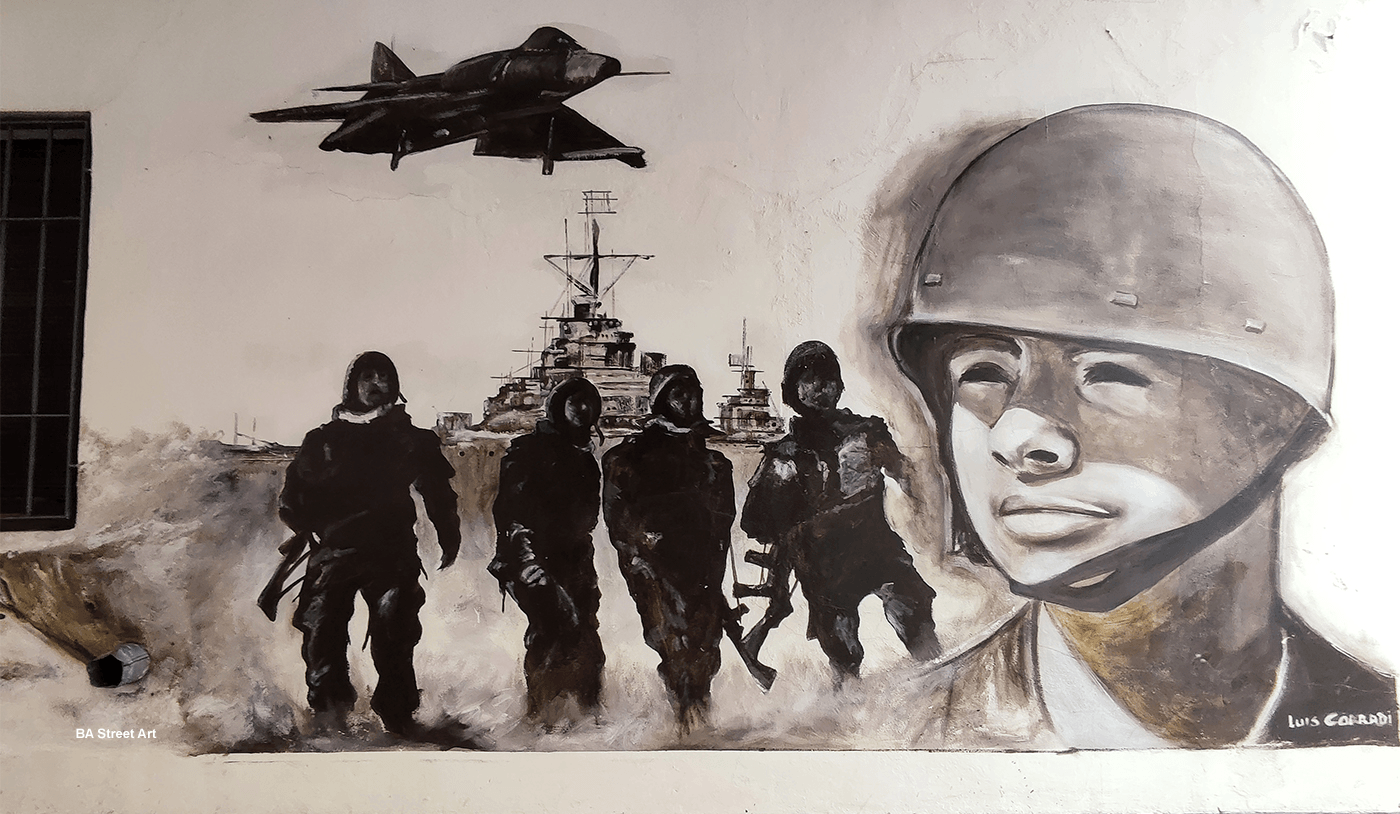 Argentine artist Luis Corradi painted a mural dedicated to veterans of the Malvinas War in Chacarita, Buenos Aires. It features soldiers and another part of the mural shows a Mirage jet flying over a battleship.