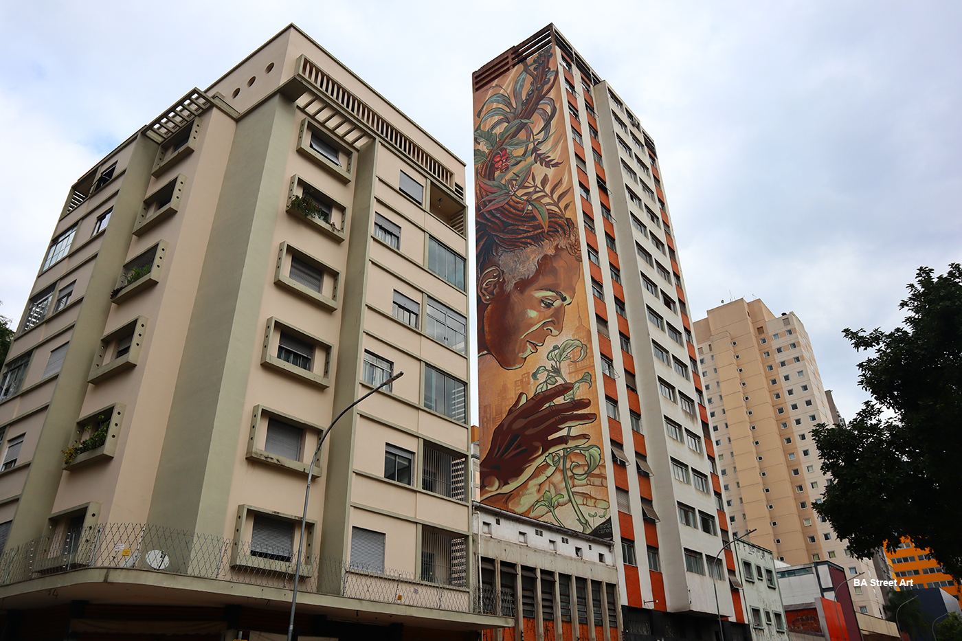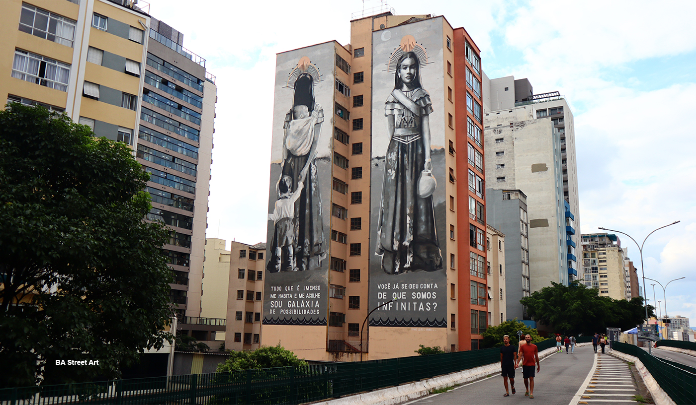 Two striking murals by Hanna Lucatelli can be seen from Praça Roosevelt. They are accompanied by the phrases: “Everything that is immense inhabits me and welcomes me, I am a galaxy of possibilities.” And: “Have you ever realised that we are infinite?”