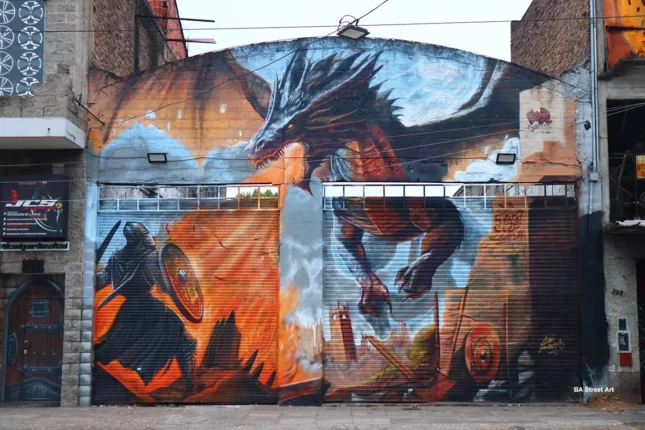 The new artwork on the front of this car mechanic workshop in Villa Luzuriaga features a knight guarding a castle while being attacked by a fire-breathing dragon.