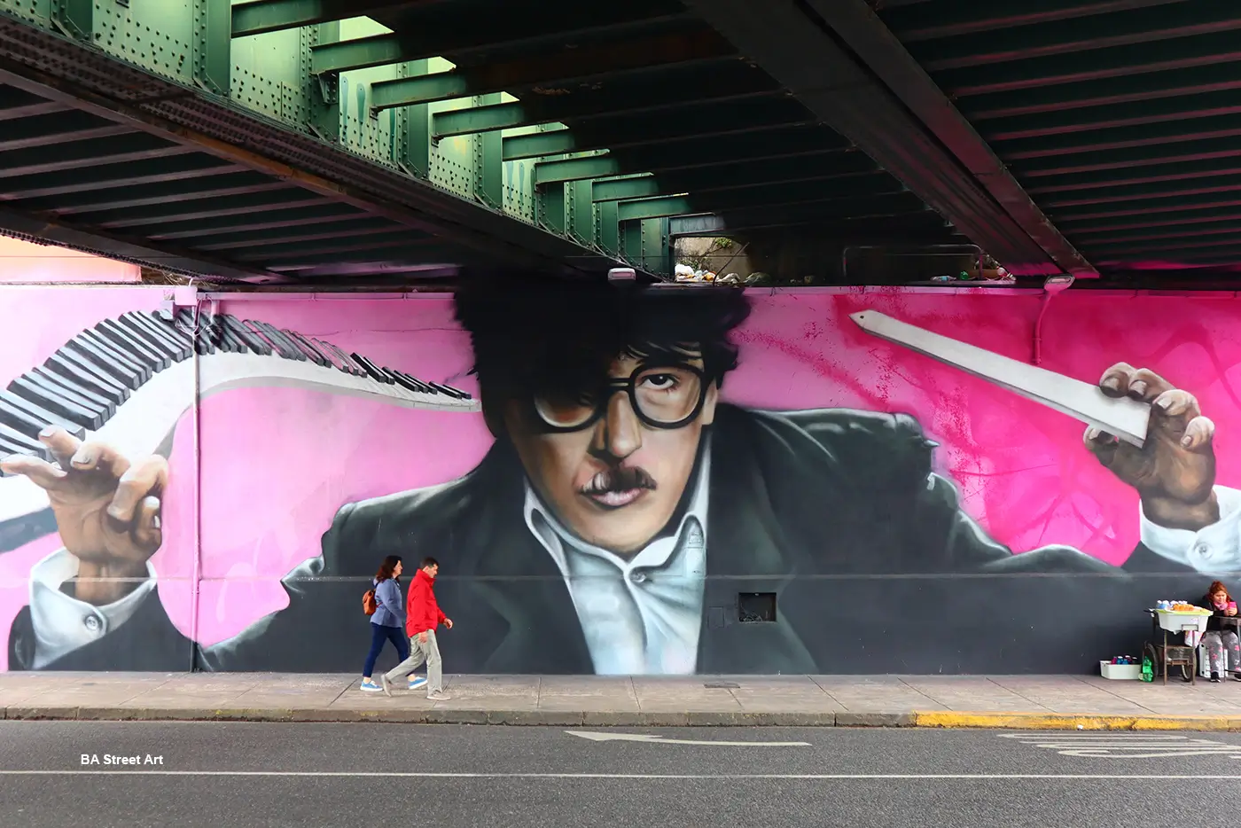 Argentine street artist painted a spectacular mural of Charly along Avenida Del Libertador in Palermo in 2023. It features him conducting an orchestra using Buenos Aires’ famous landmark the Obelisk as a baton with a piano keyboard floating in the background.