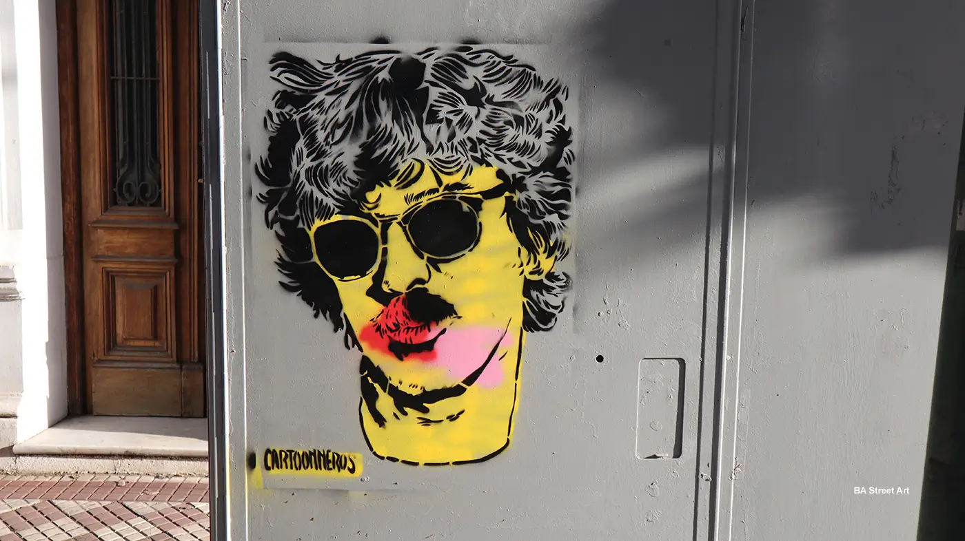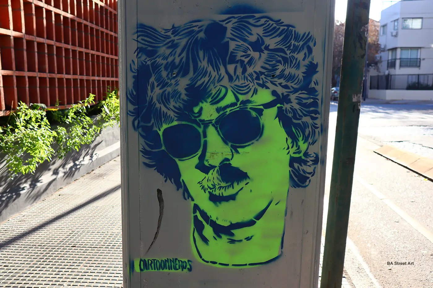 Multi-coloured stencils of Charly Garcia by Cartooneros can also be spotted in neighbourhoods like Villa Ortuzar, La Paternal and Colegiales. These have been painted on electrical boxes.