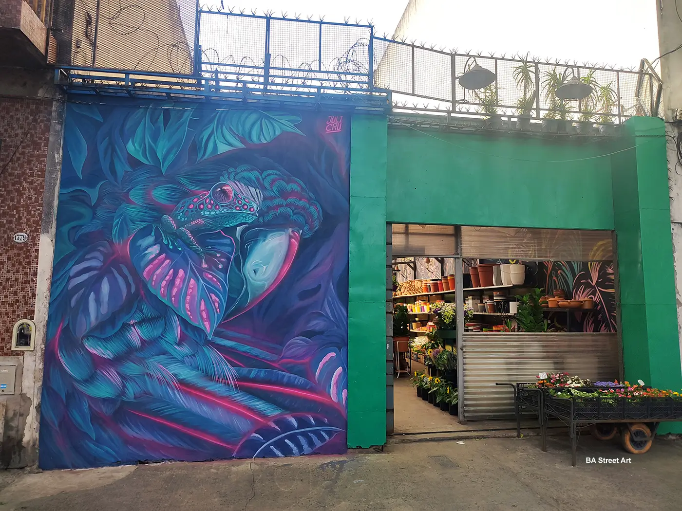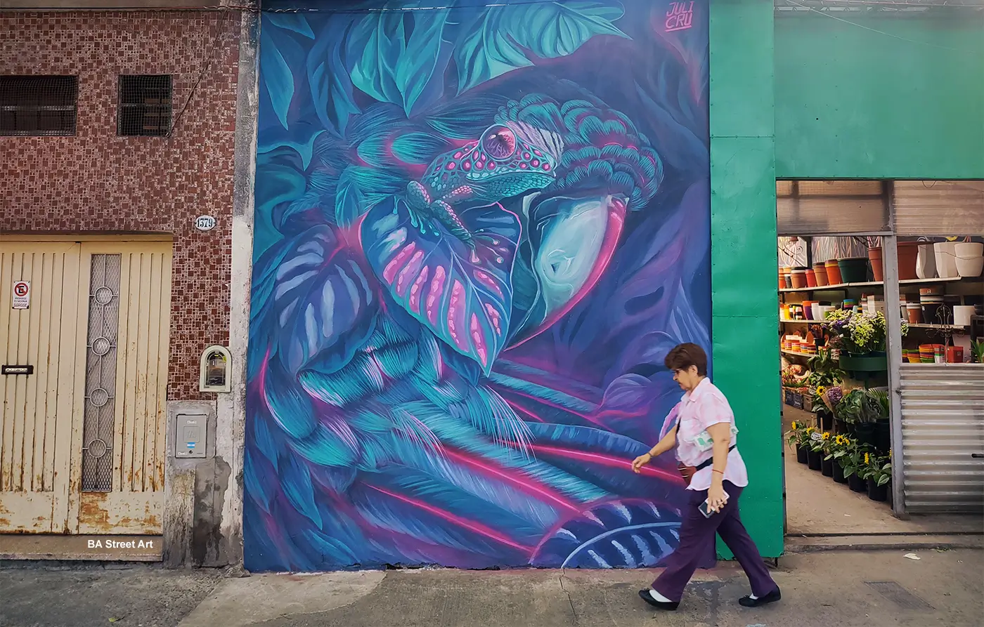 This mural on the front of this garden centre in Parque Chacabuco features a frog sat amongst leaves in a tropical rain forest.