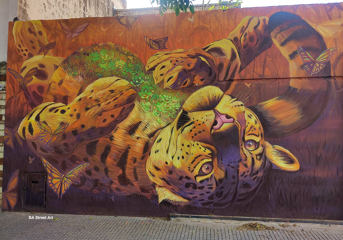 This new mural features a jaguar lying on his back with his stomach covered with flowers and butterflies hovering around.