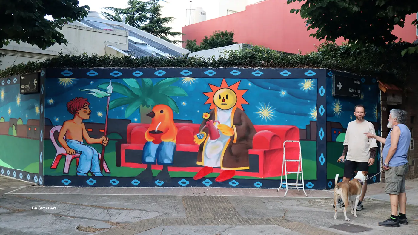The new mural in the neighbourhood of Saavedra incorporates different elements of Argentine and Qatari culture. The three characters sitting down together include a cartoon-style bird drinking maté; a figure wearing a traditional Qatari gown known as a ‘bis’ while pouring Arabic coffee known as ‘qahwa’ from a traditional jug, plus a boy on a chair holding a lance.