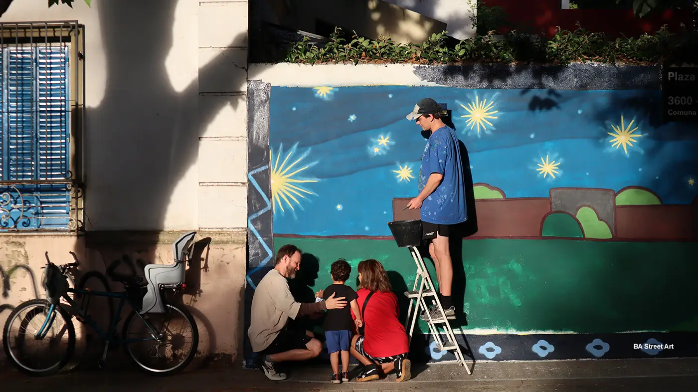 A couple of neighbours in Saavedra lent a hand painting a small part of the mural, with Dimitrije Bugarski (artist & planning specialist at Qatar Museums) also helping inspire a young boy to pick up a spray can. “So many people, especially young children with their parents, stopped in front of the mural to stare at it, talk with the artists, watch them paint and discuss what they were looking at with others,” said Matt from BA Street Art. “That’s the power of art – it’s able to break down barriers, bring people together and can help you make friends with people who might live just around the corner that you’ve never met before, or people who live in a country like Qatar that’s thousands of miles away!”