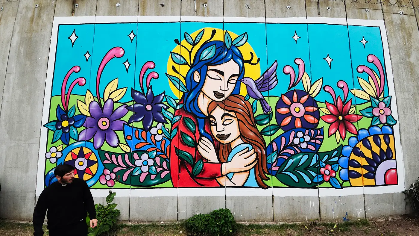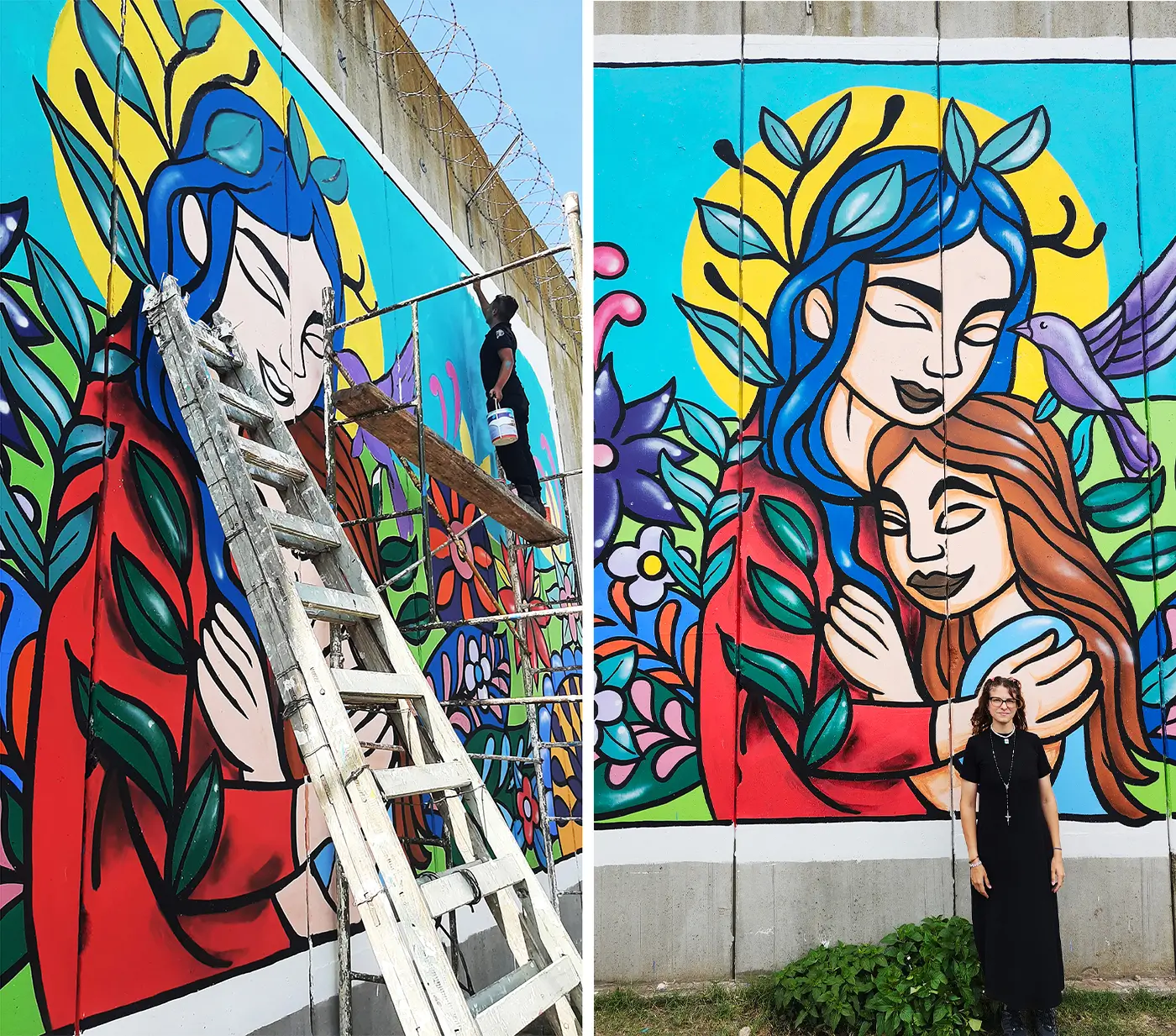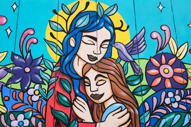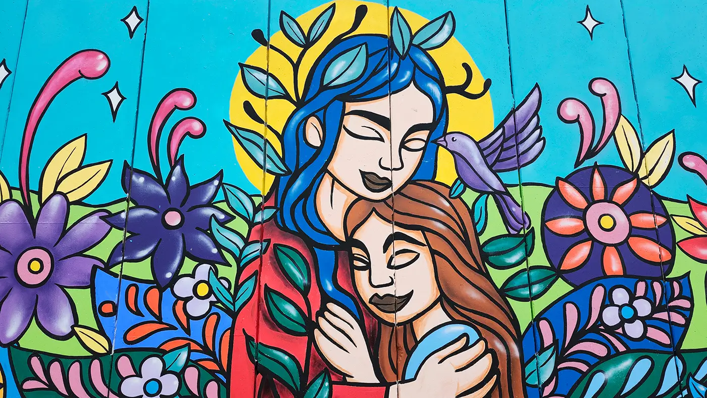 The theme of the mural relates to ‘inner child’ healing that is a way of connecting with one’s true self as an infant to help heal the younger part of your psyche that still influences how you think, feel, and react as an adult. CEB explained: “The poem is about what an adult woman says to her inner child. She gives her the love and words she needed but didn’t receive at the time. It’s a way of reinterpreting past experiences and transforming those feelings through love and acceptance, now from an adult perspective. That’s why there’s a woman embracing that child from her past, accompanied by colorful elements like mandalas and flowers.”